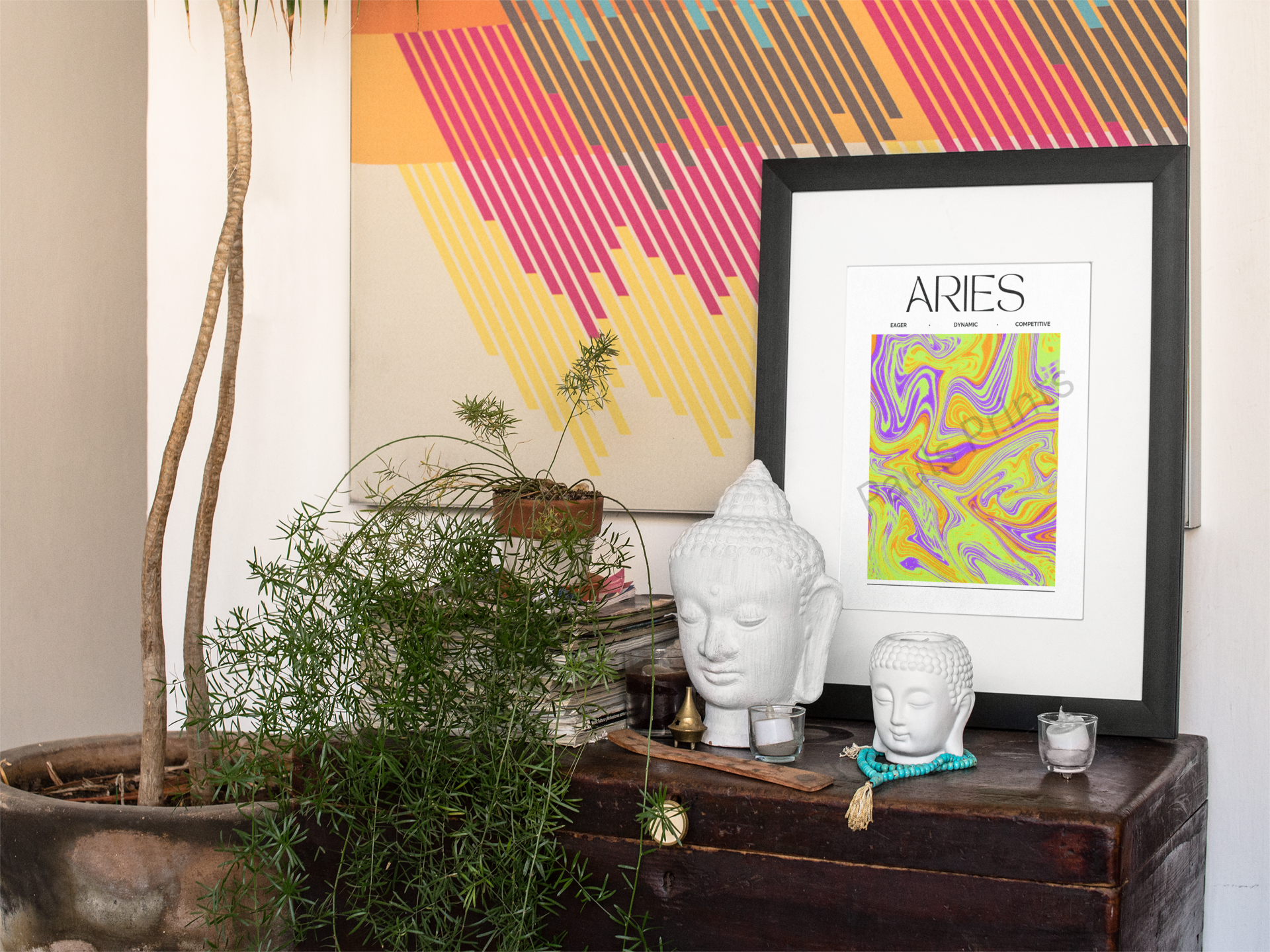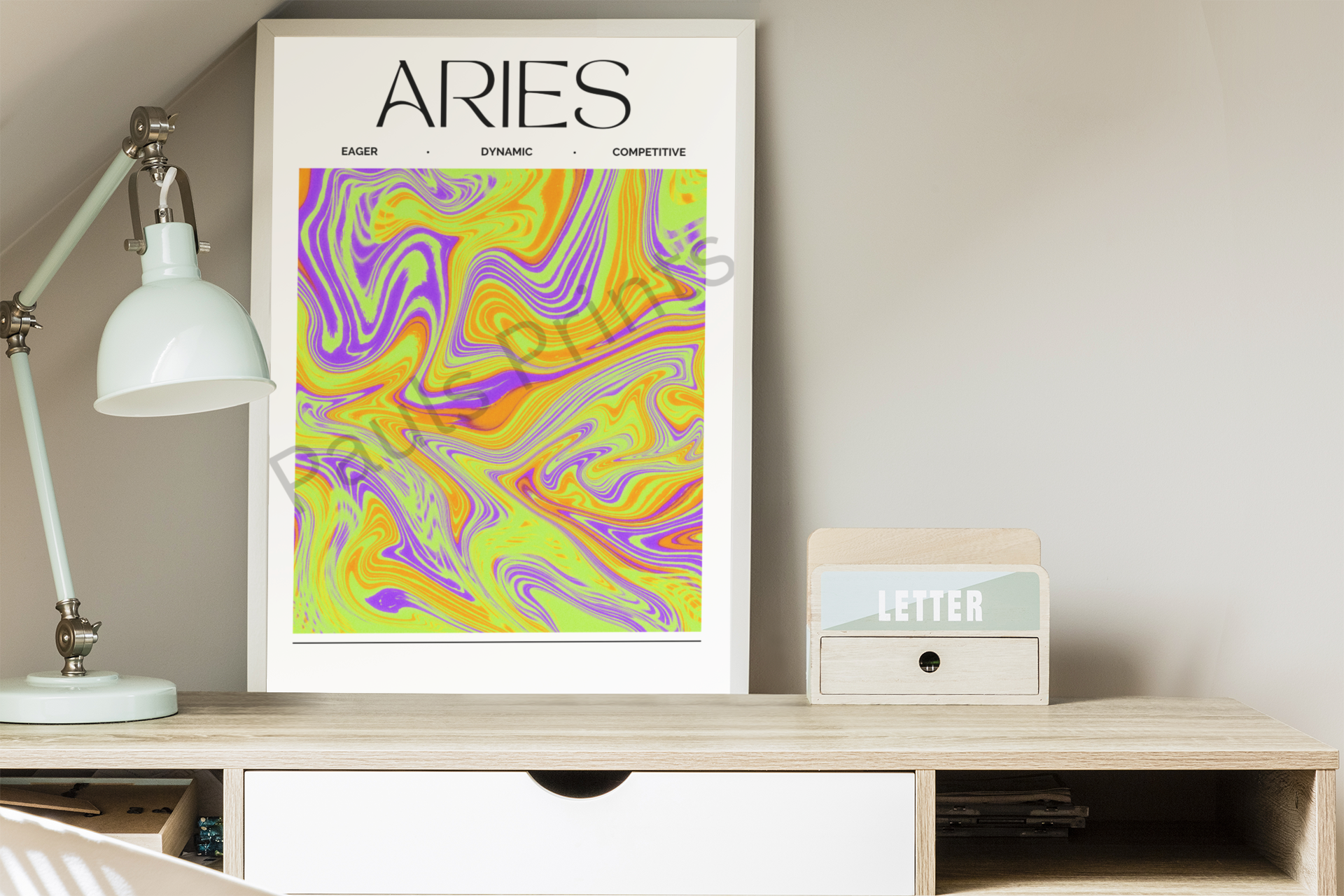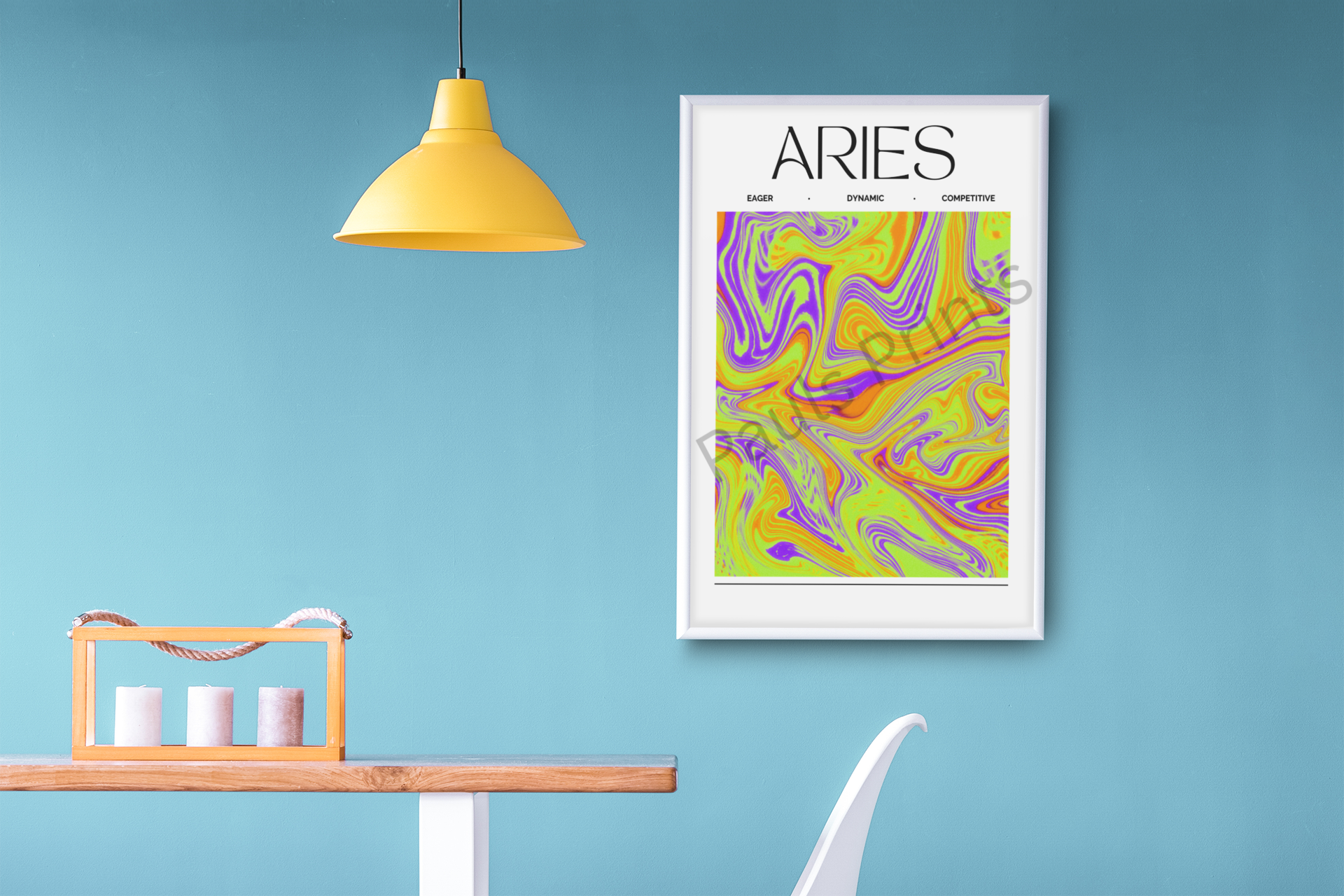 Bring the bold and fiery energy of Aries into your home with this vibrant abstract zodiac wall art print. Featuring electrifying tones of orange, purple, and lime green, this artwork captures Aries traits – “Eager, Dynamic, Competitive.” Perfect as a birthday gift or a striking piece of décor for anyone born under the sign of Aries.