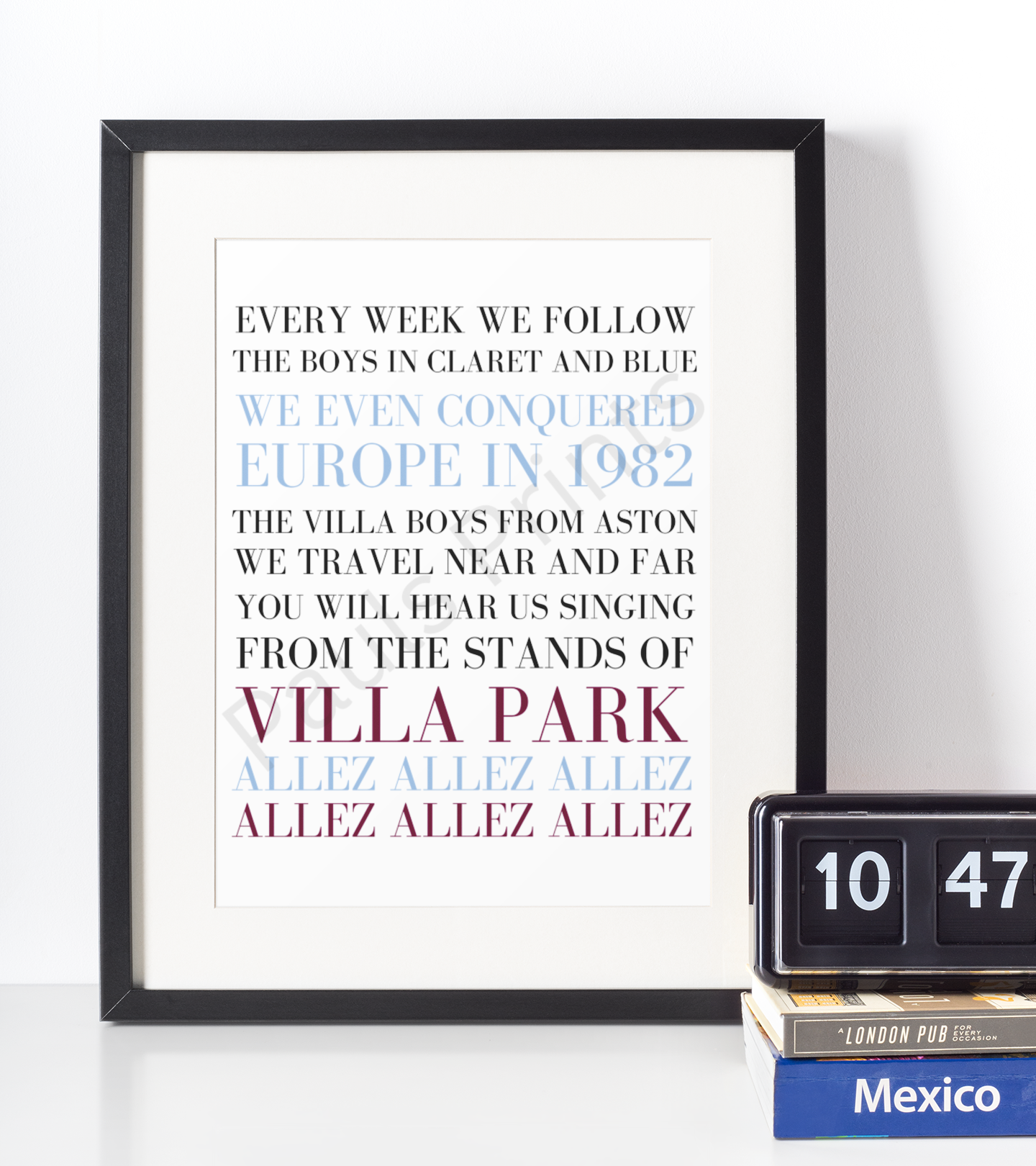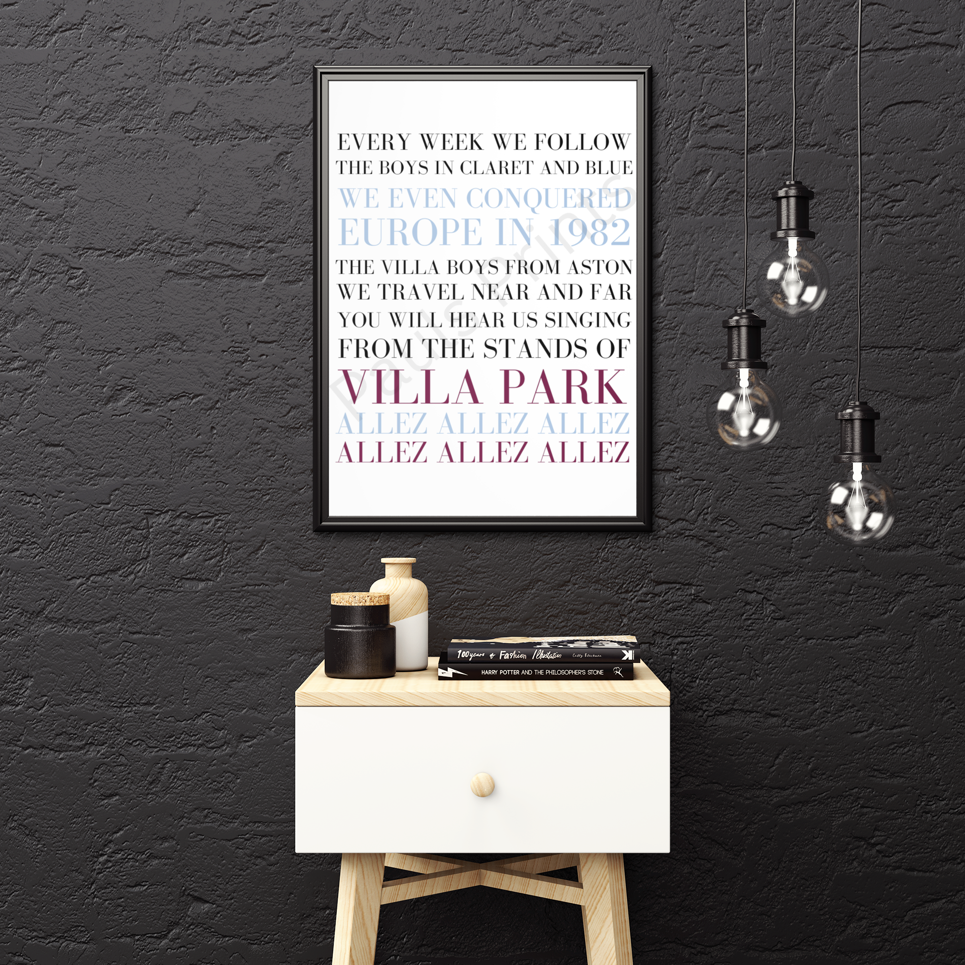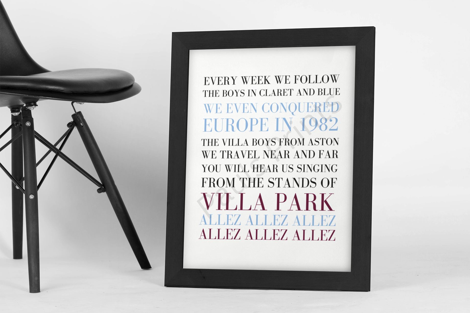 Bold and stylish football typography wall art featuring the iconic Aston Villa chant celebrating the boys in claret and blue and the spirit of Villa Park. Designed in classic club colours with strong, modern lettering, this statement print is perfect for bedrooms, games rooms, offices or any dedicated fan space. A great gift for Aston Villa supporters of all ages, this print captures the pride, history and matchday atmosphere of following the Villa home and away, near and far.