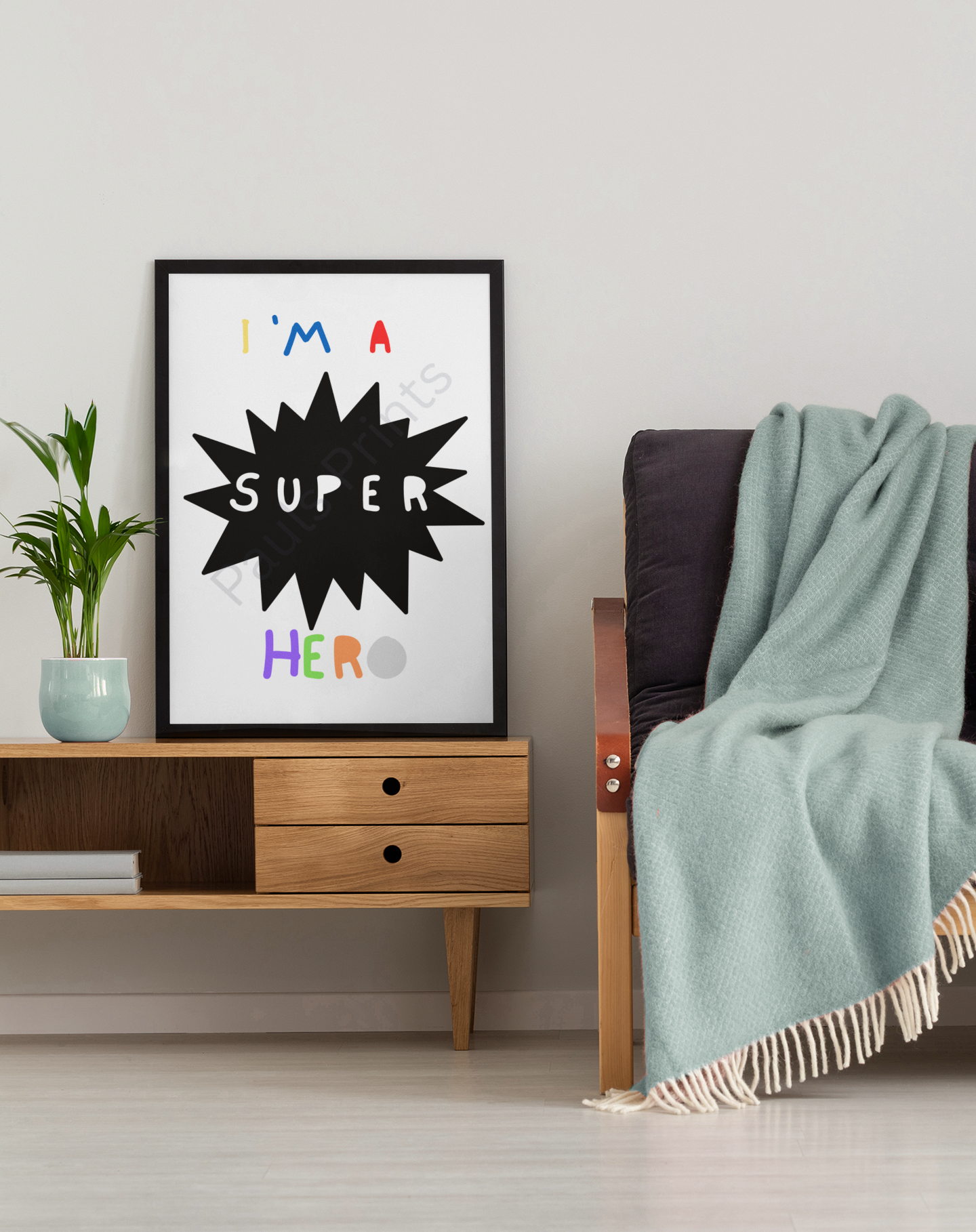 This I’m a Super Hero wall art print features bold shapes and bright colours paired with playful typography to create a fun and confidence-boosting design. Perfect for children’s bedrooms, playrooms, or nurseries, it adds energy and positivity while encouraging imagination and self-belief. The simple layout and cheerful colour palette make it an easy fit for modern family homes and vibrant kids’ spaces alike.