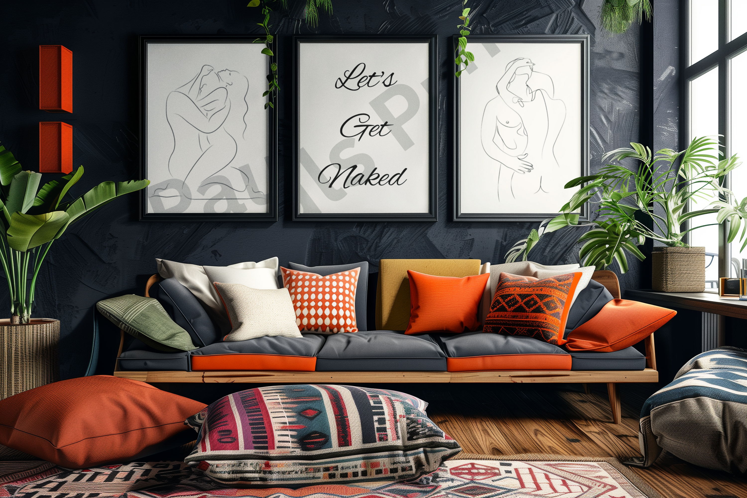 A bold and provocative three-piece set combining sleek minimalist line art of intimate couples with the daring statement “Let’s Get Naked”. Perfect for adding a touch of passion and playful confidence to bedrooms or private lounges, this modern black-and-white design balances elegance with raw desire.