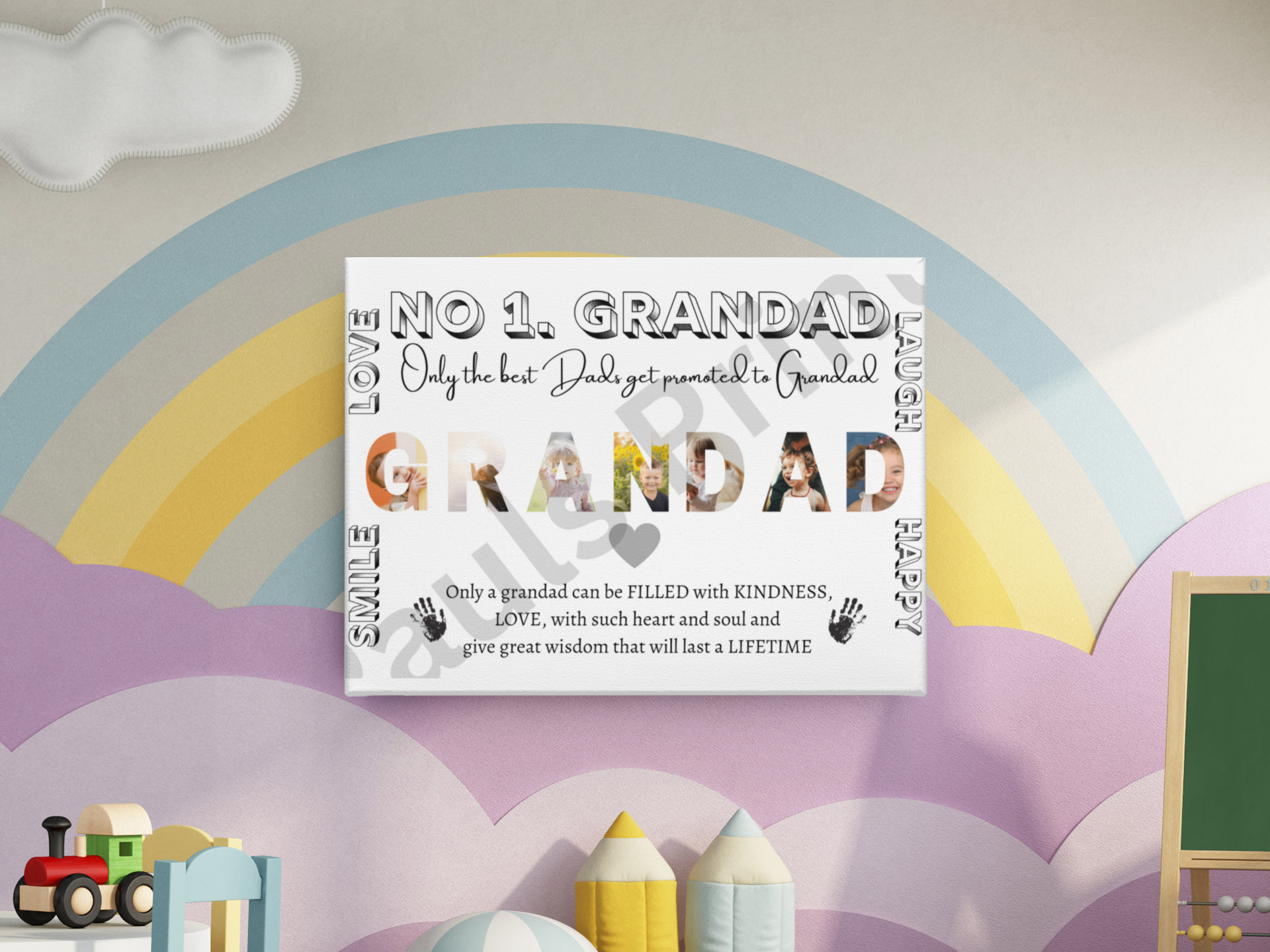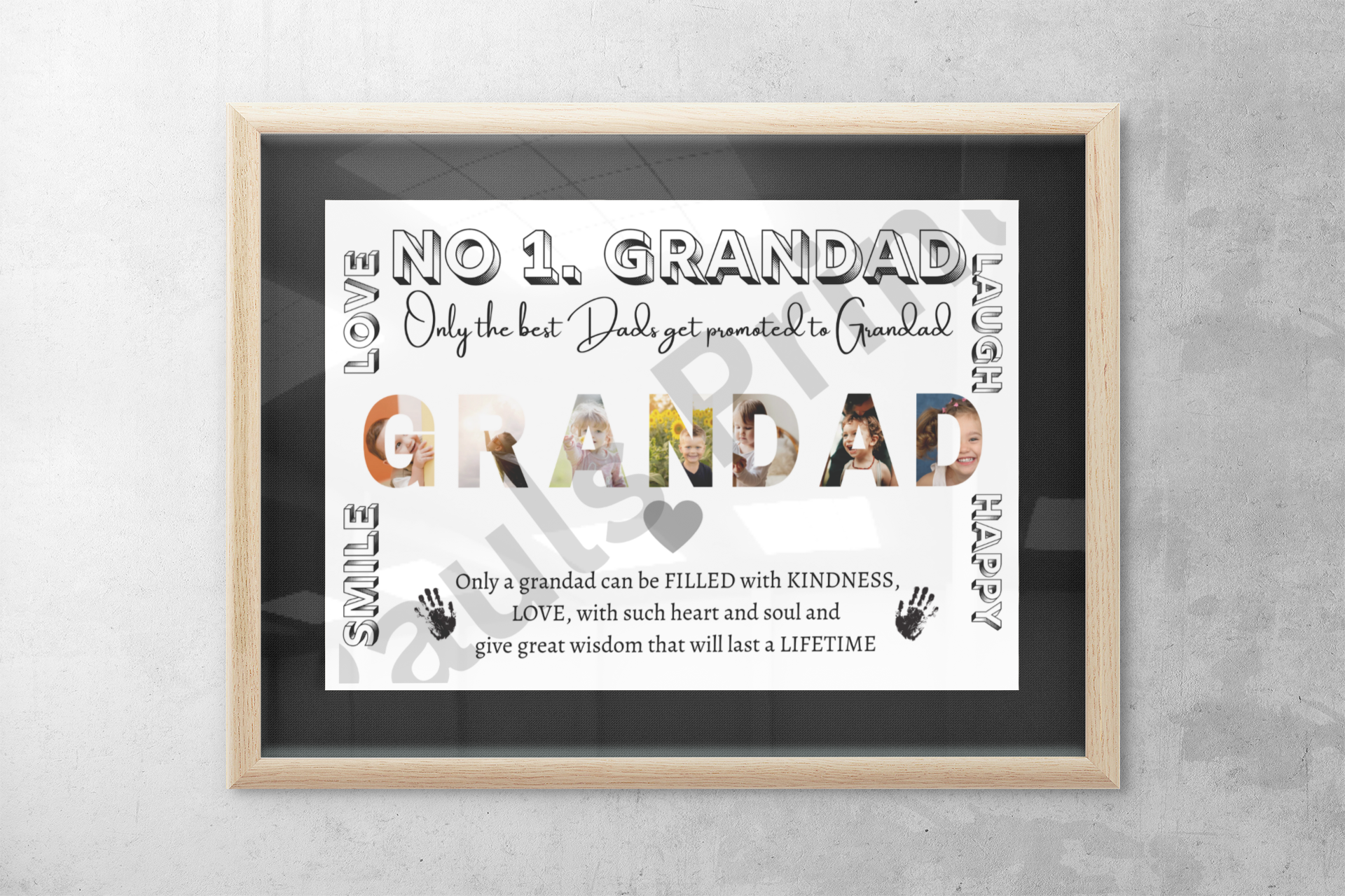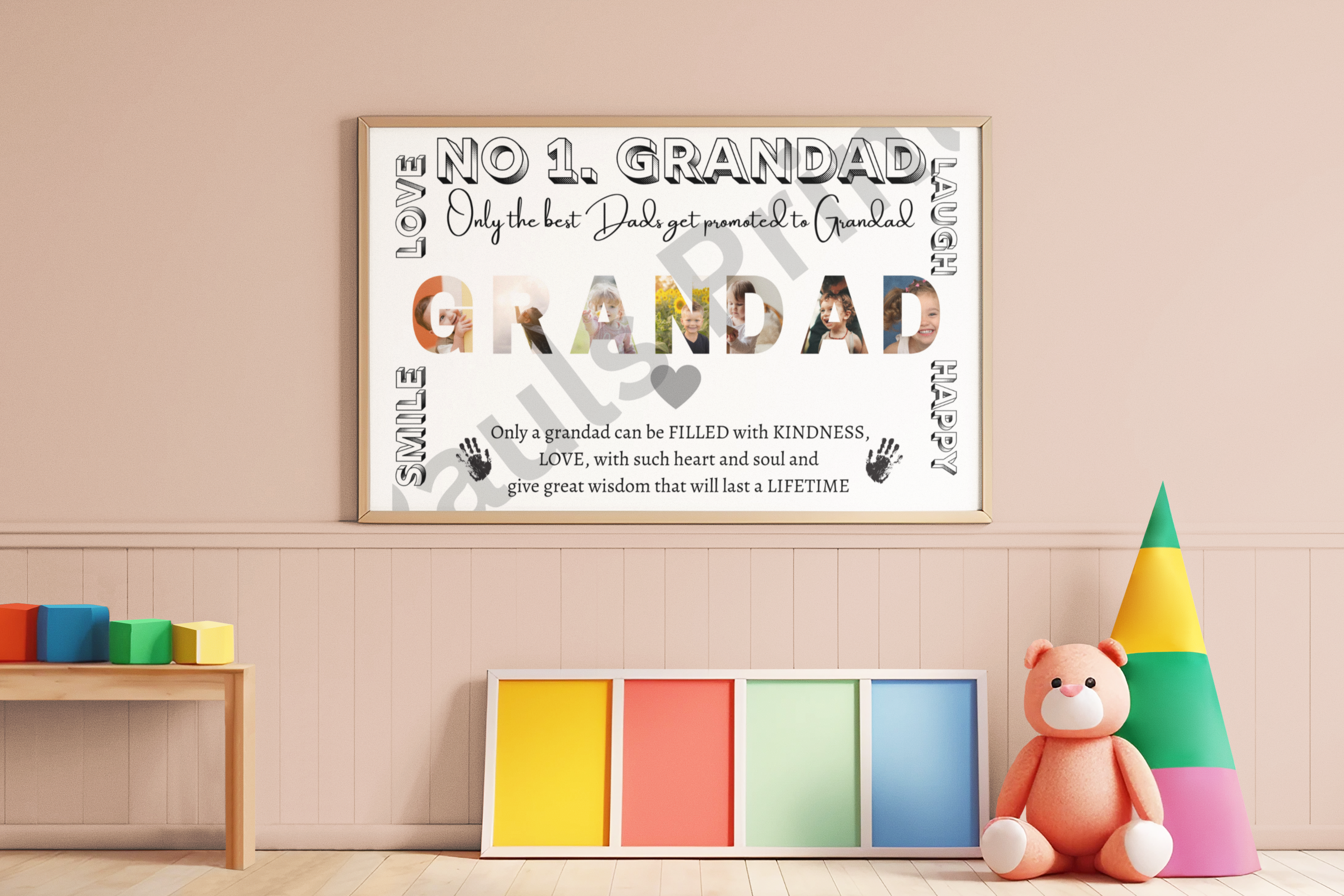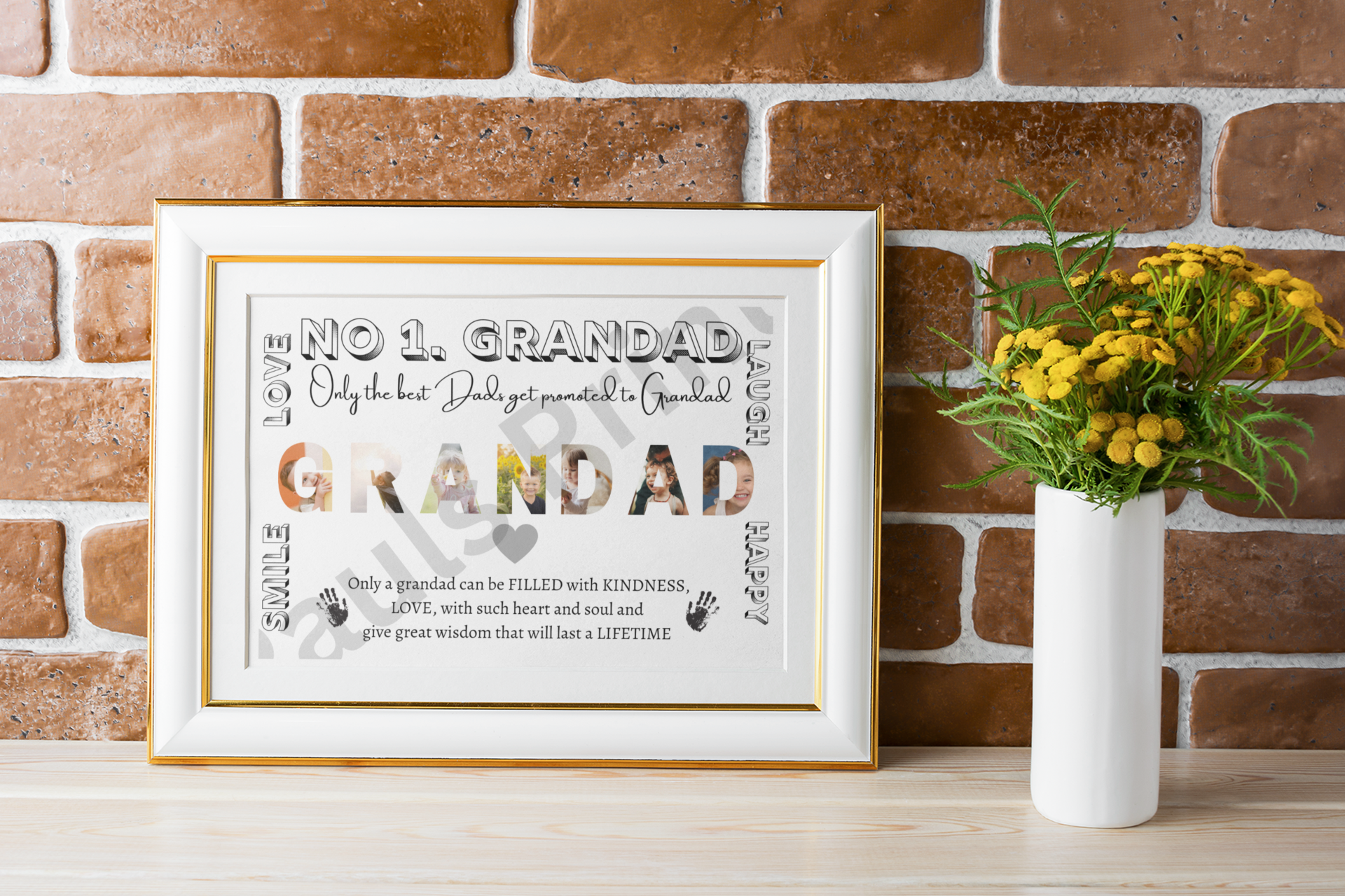 Celebrate the special bond with your grandad through this heartfelt No. 1 Grandad photo collage print. Featuring the touching phrase, “Only the best dads get promoted to grandad” and personalised with cherished photos, it’s the perfect keepsake to show appreciation for his kindness, wisdom, and love. Ideal as a Father’s Day, birthday, or Christmas gift.