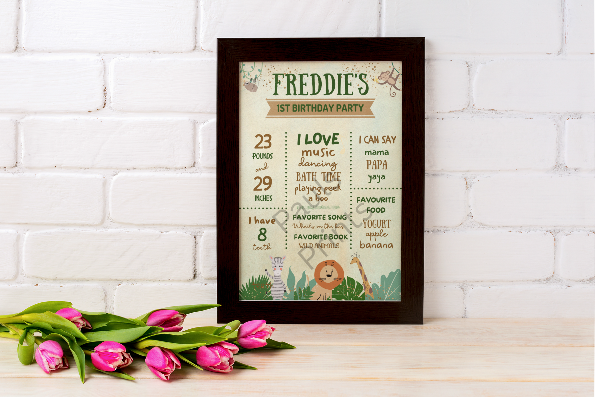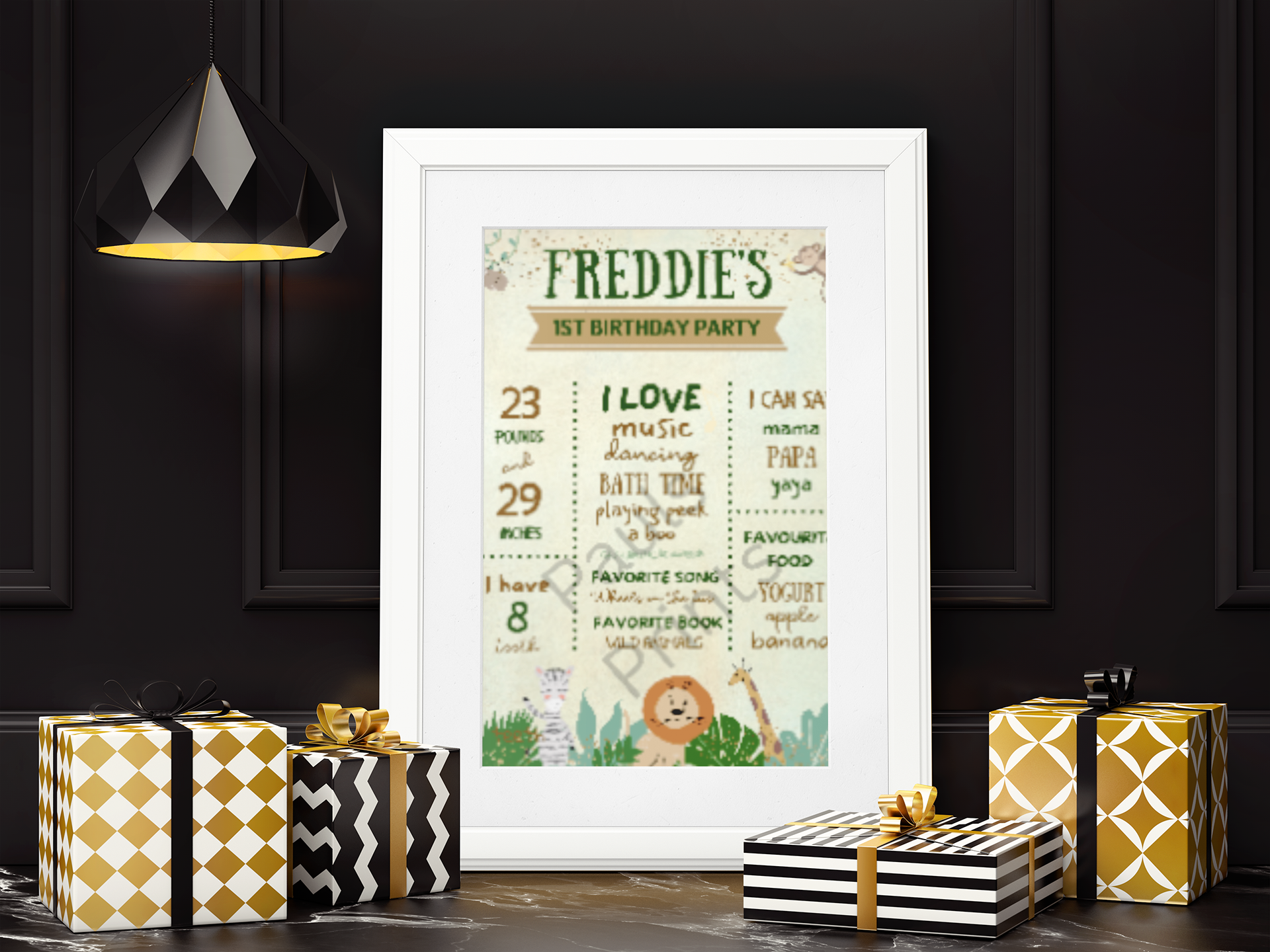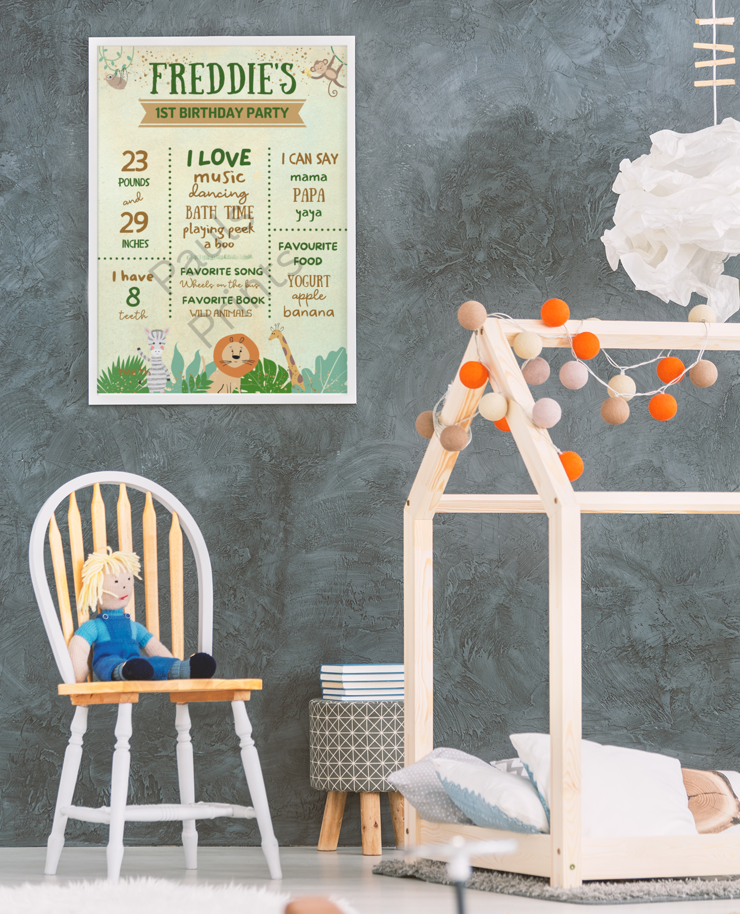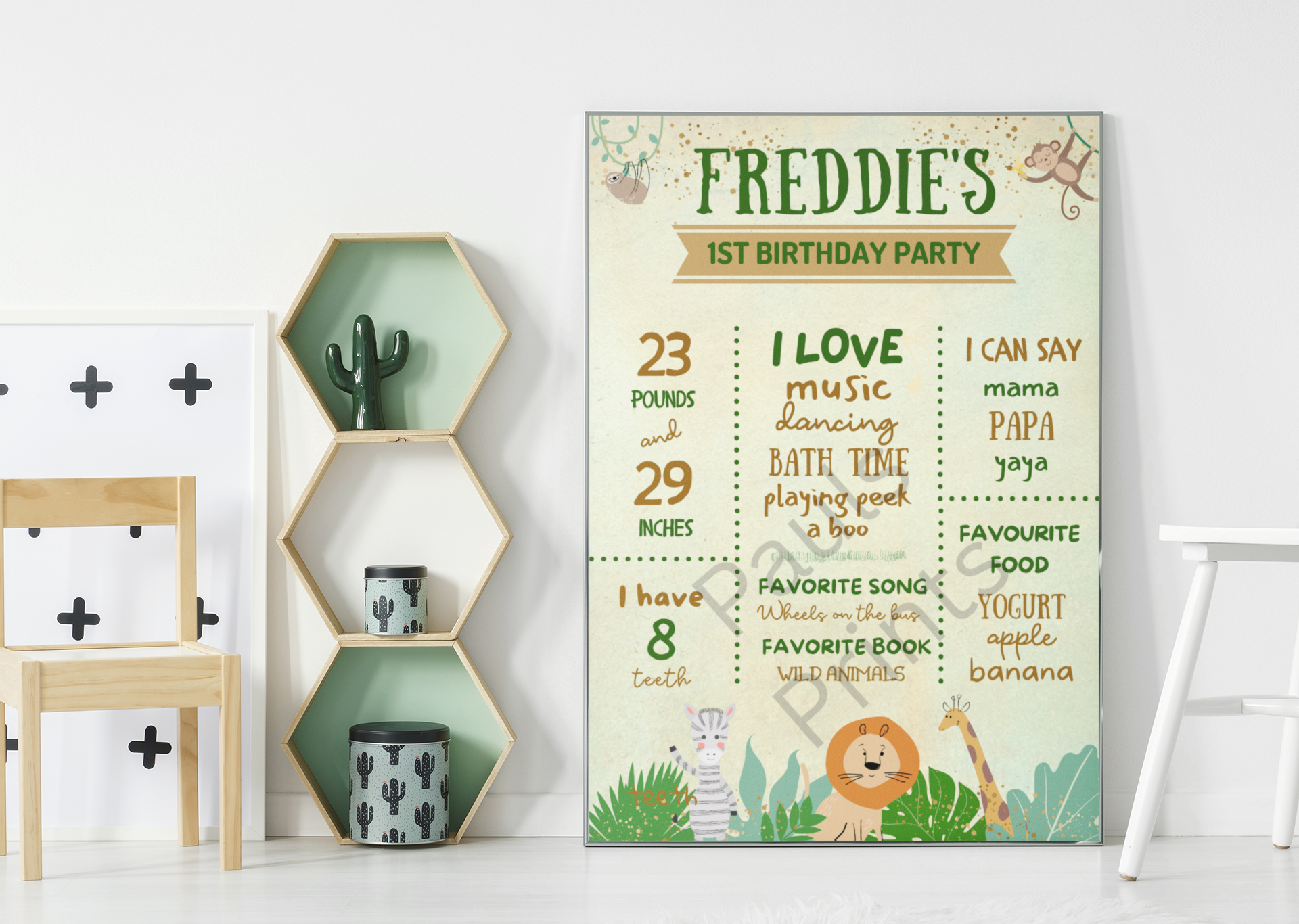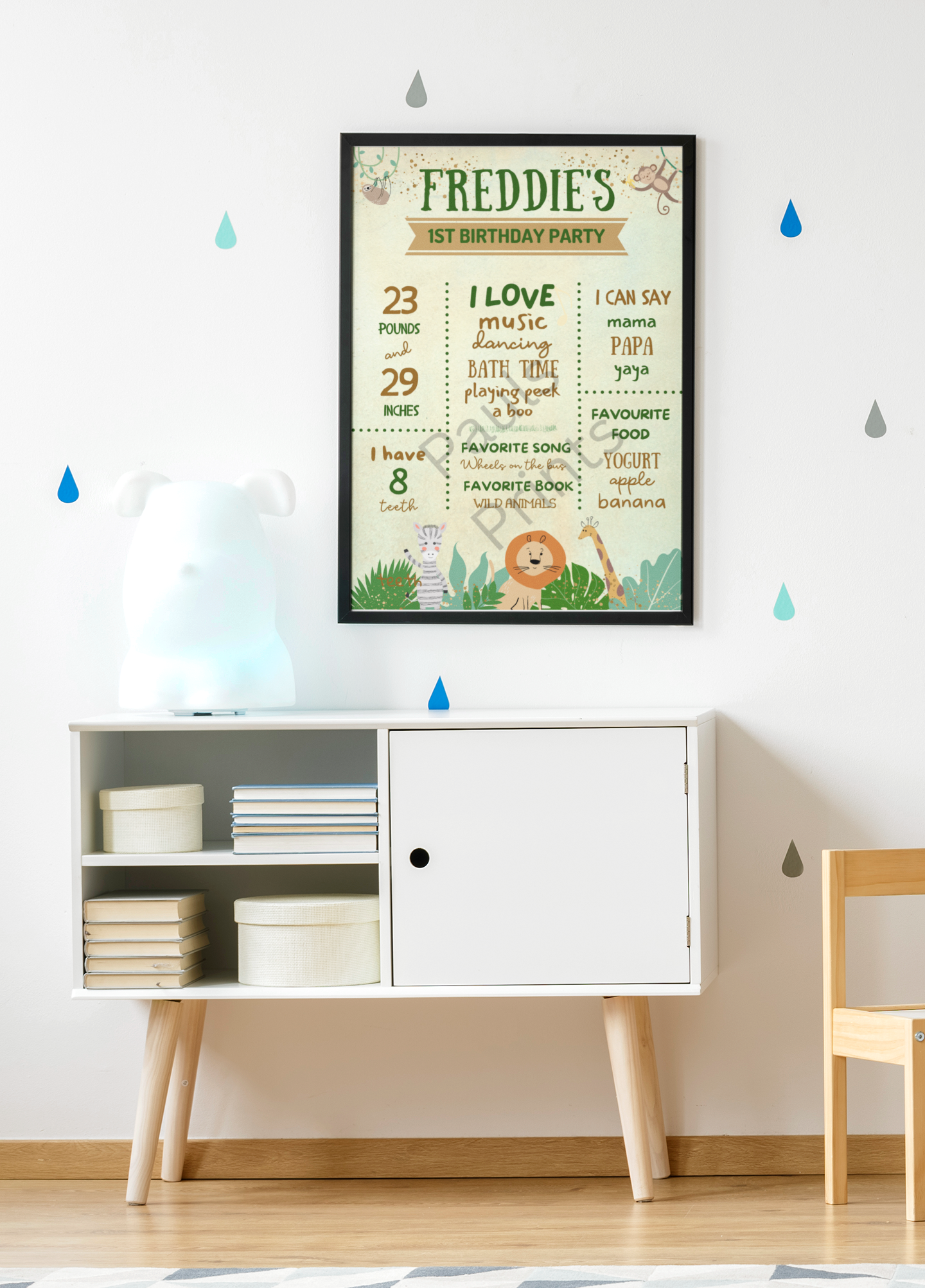 Personalised 1st Birthday Milestone Poster – Jungle Safari First Birthday Board – Custom Baby Stats Birthday Print