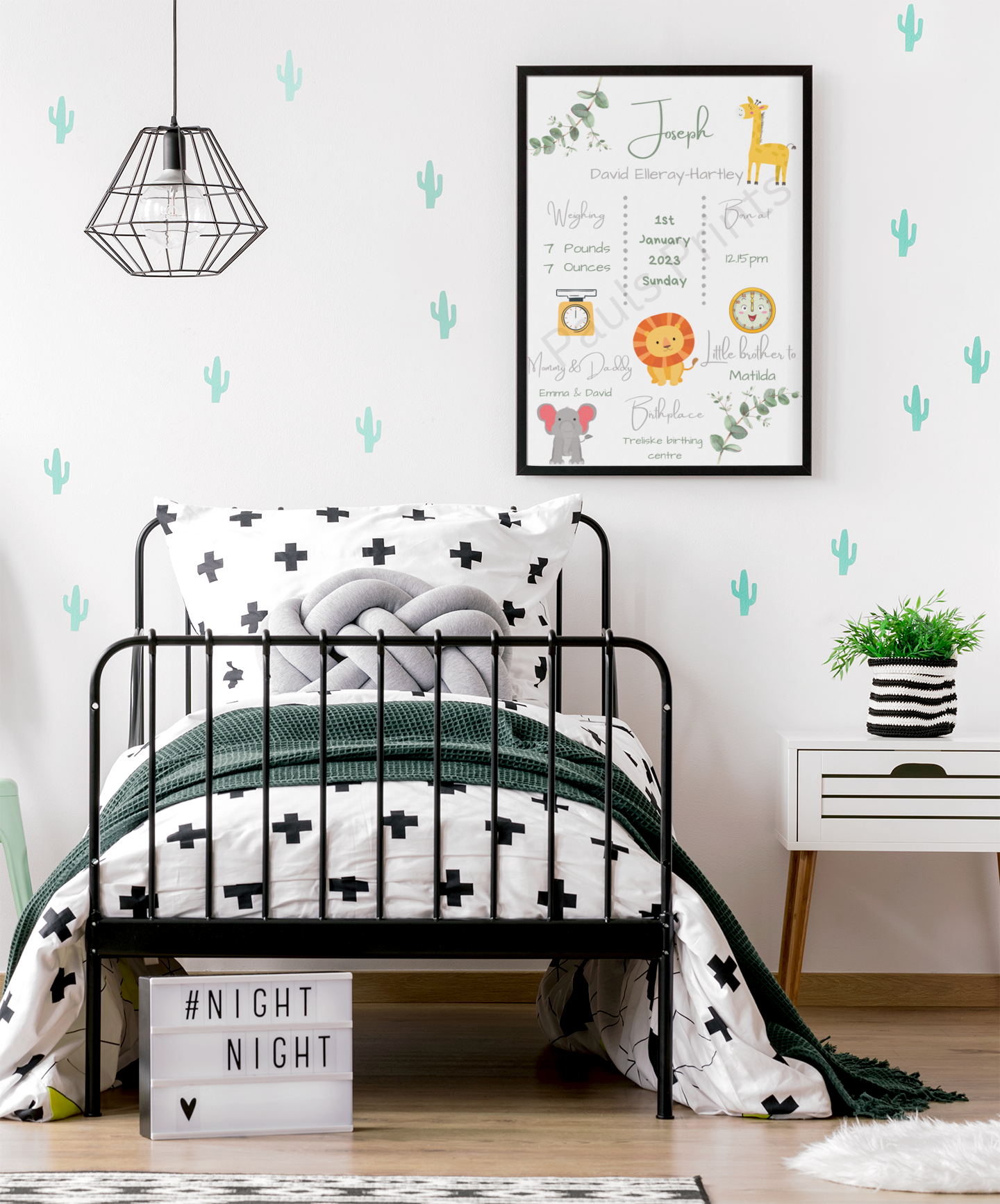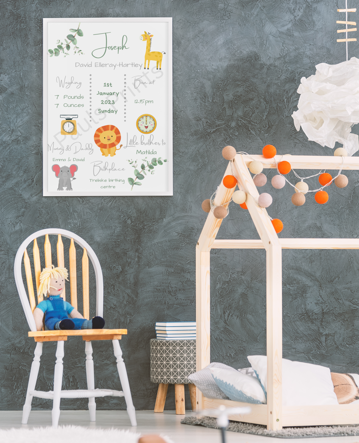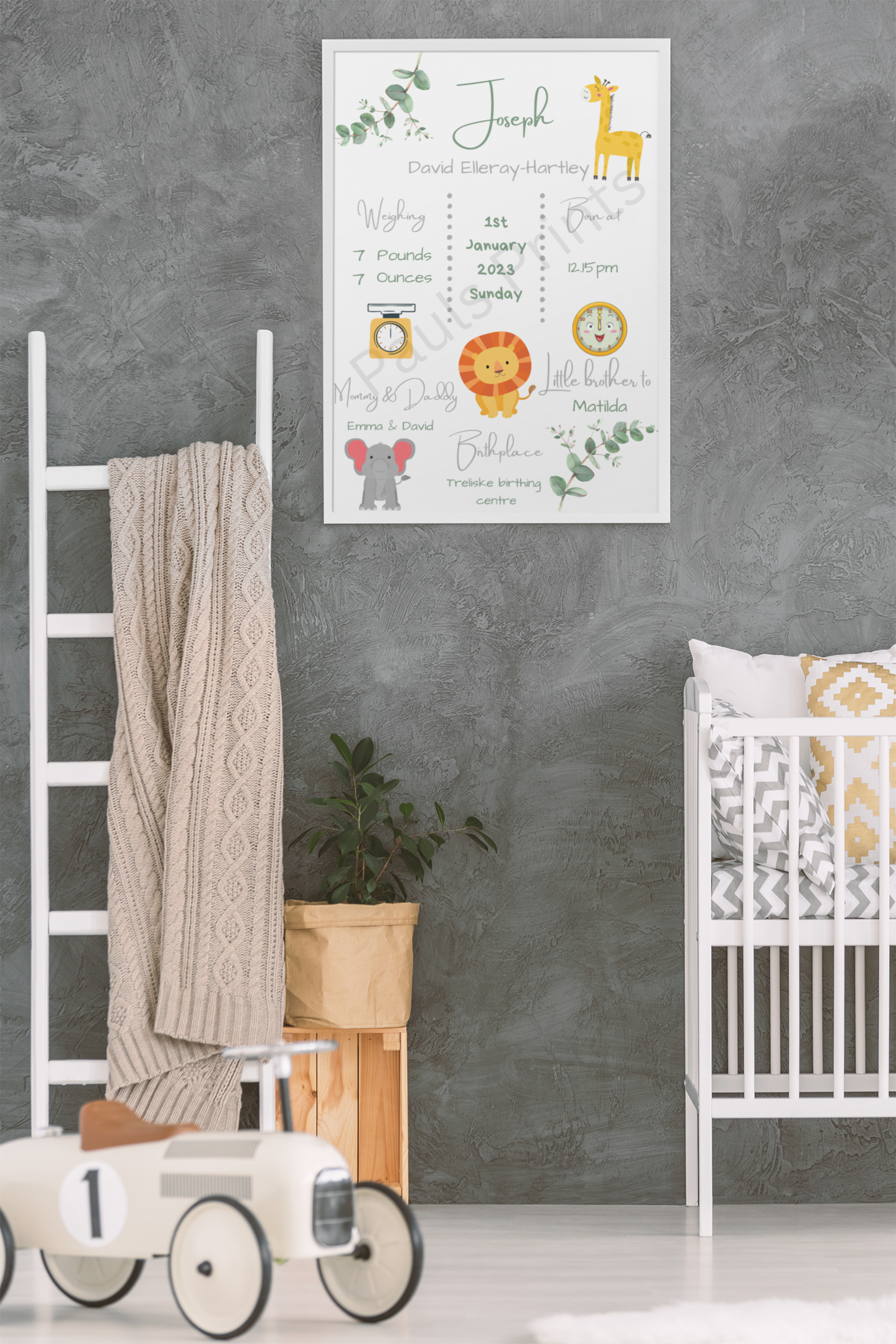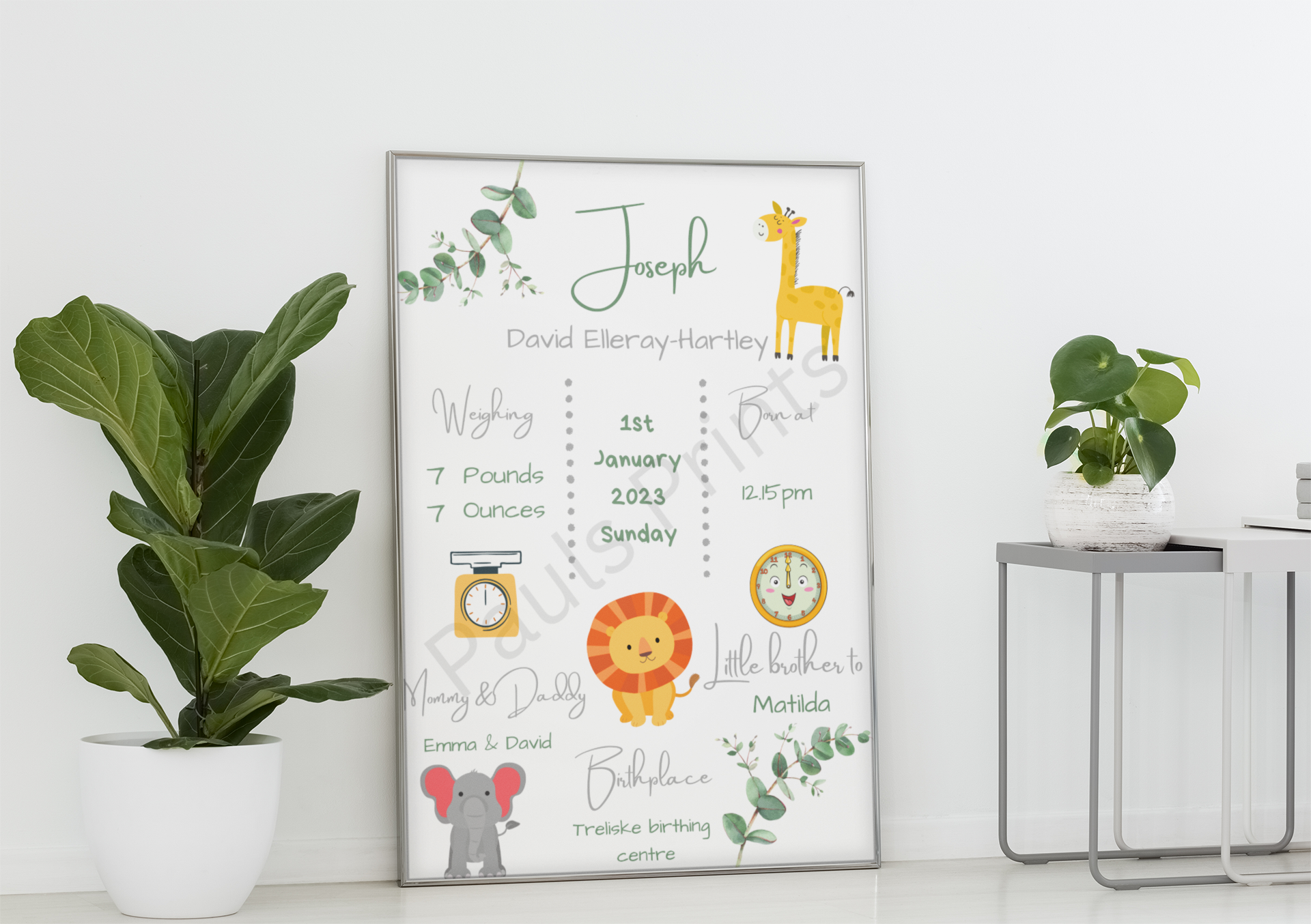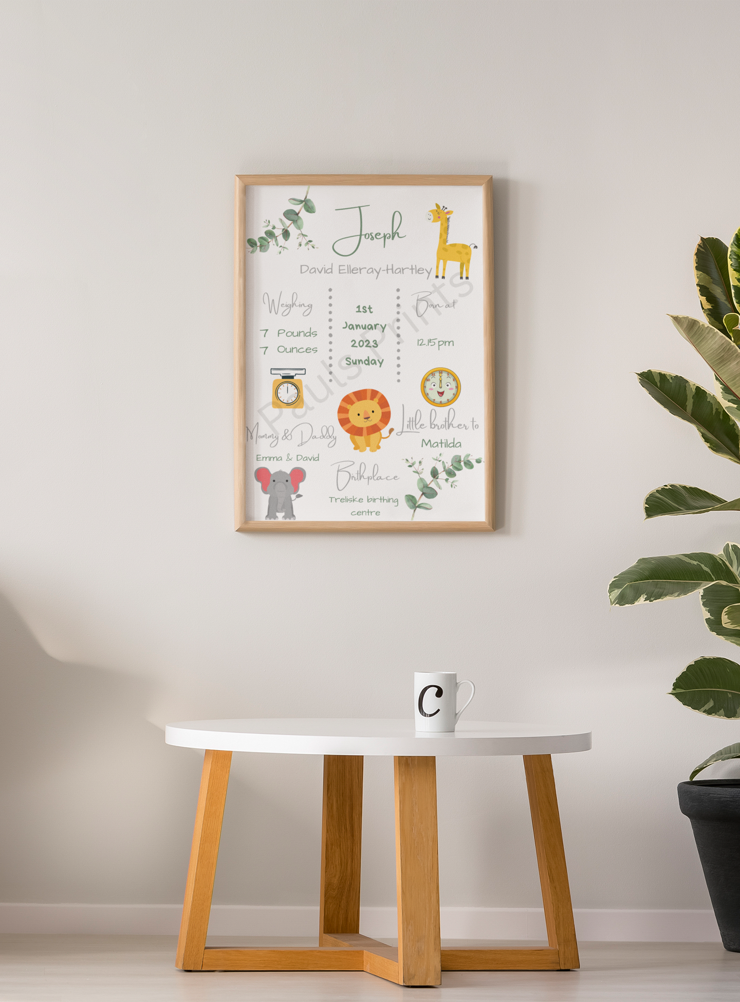 This beautiful personalised baby birth print is a perfect way to celebrate a new arrival. Featuring your baby’s name and birth details — including date, time, weight, parents’ names and birthplace — this soft safari-themed design makes a timeless keepsake for a nursery or child’s bedroom.