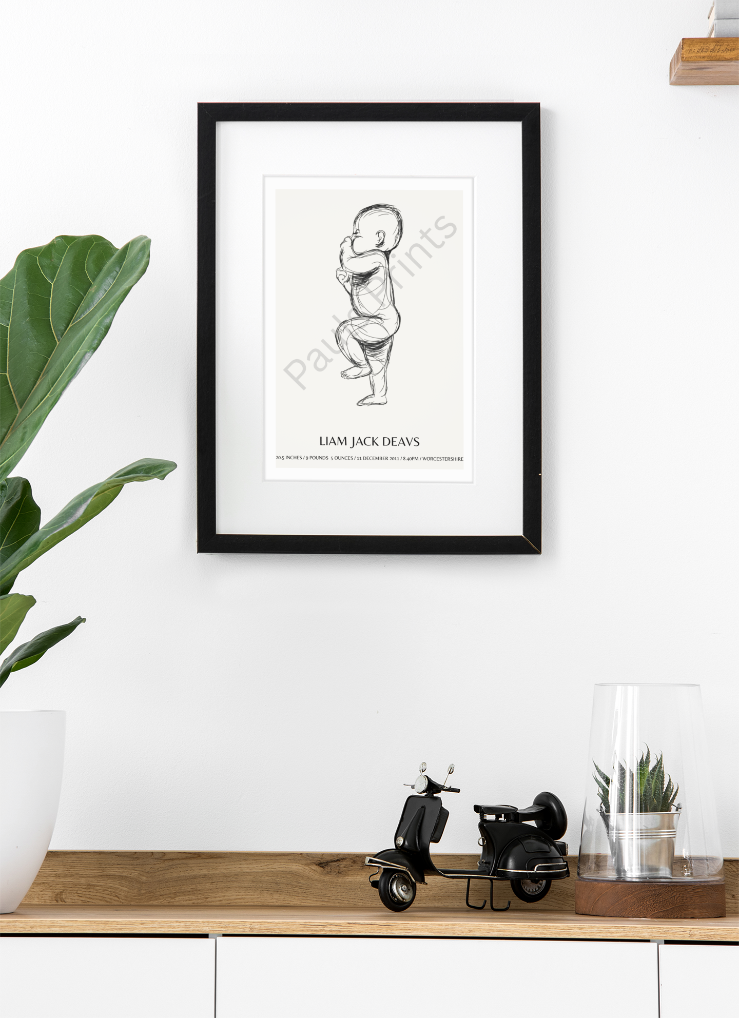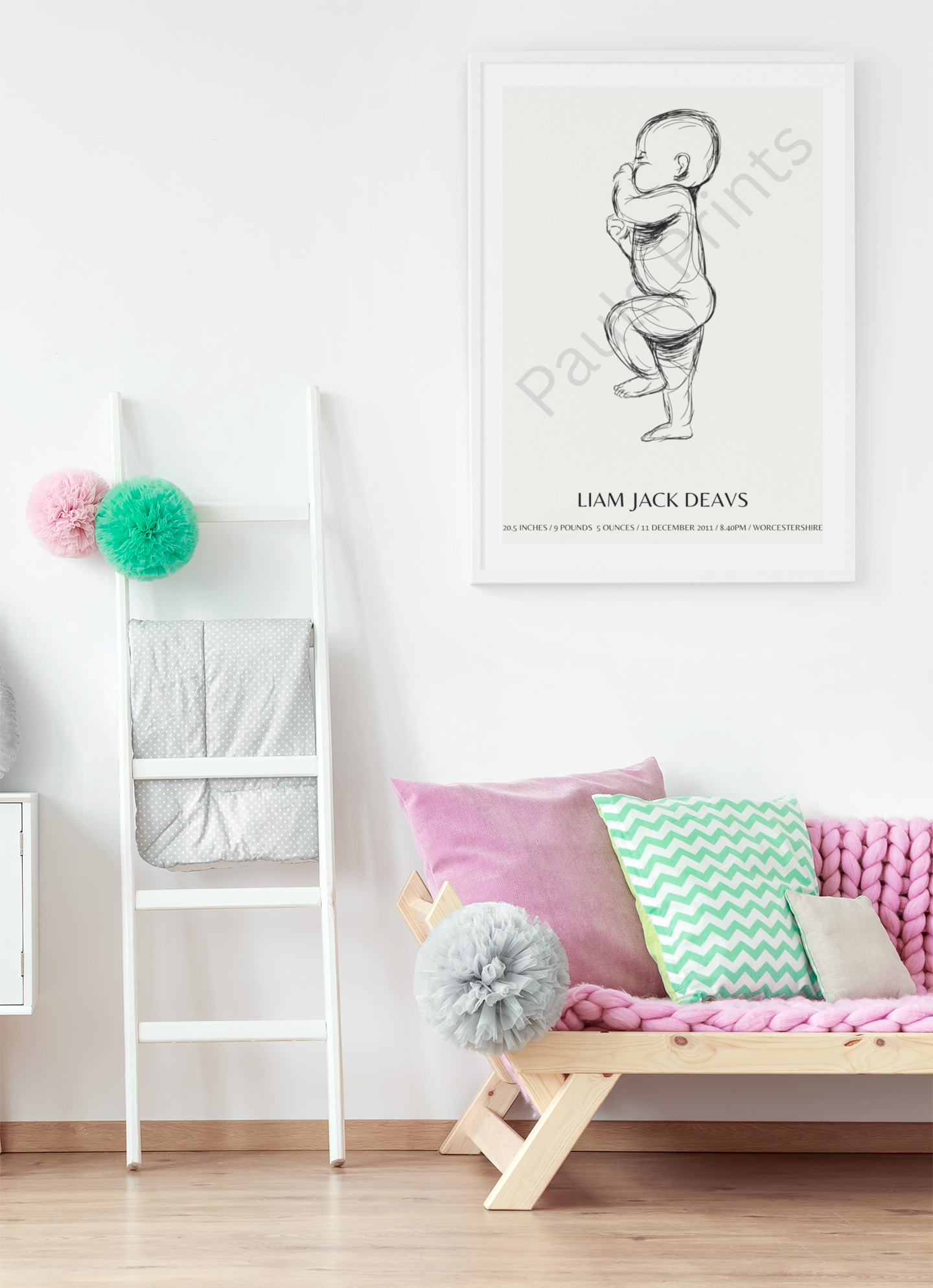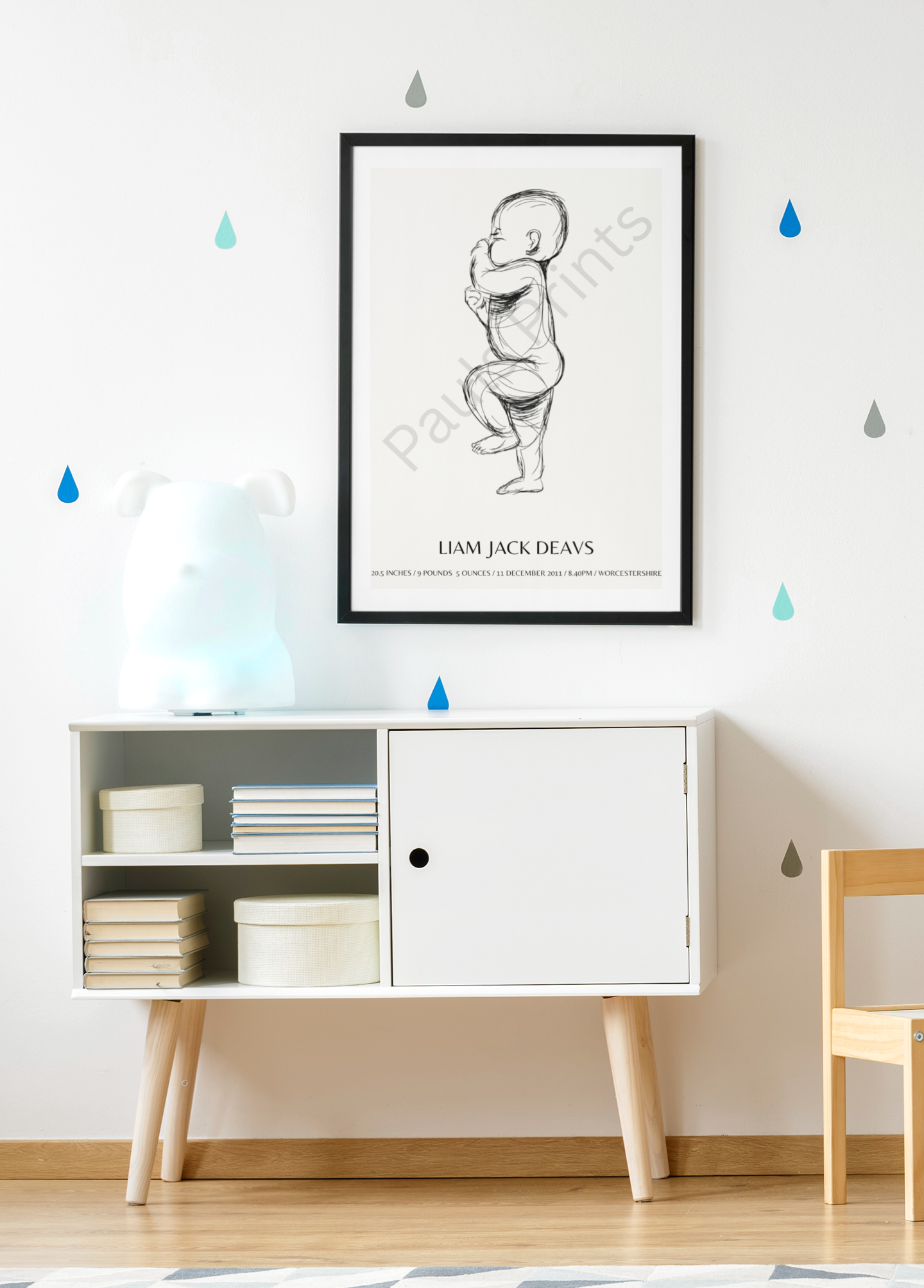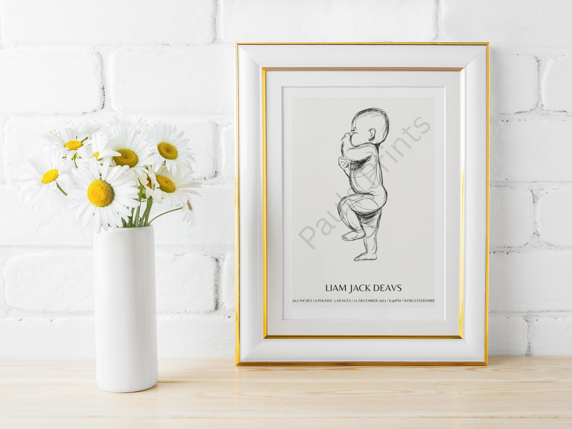 Each print is customised with the baby’s name, birth date, weight, time, length, and location, creating a meaningful piece of wall art that tells the story of their very first day. The elegant monochrome sketch style keeps the design soft and modern, making it perfect for nurseries, bedrooms, or family gallery walls.