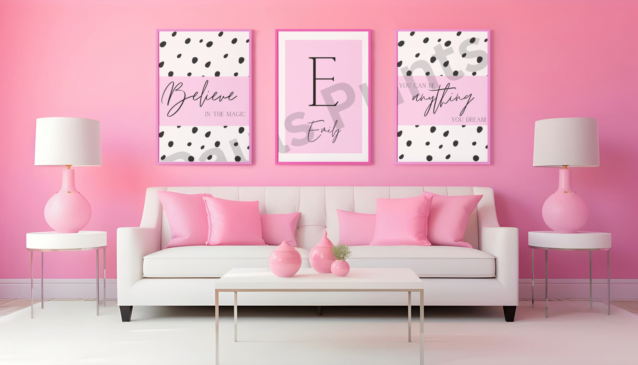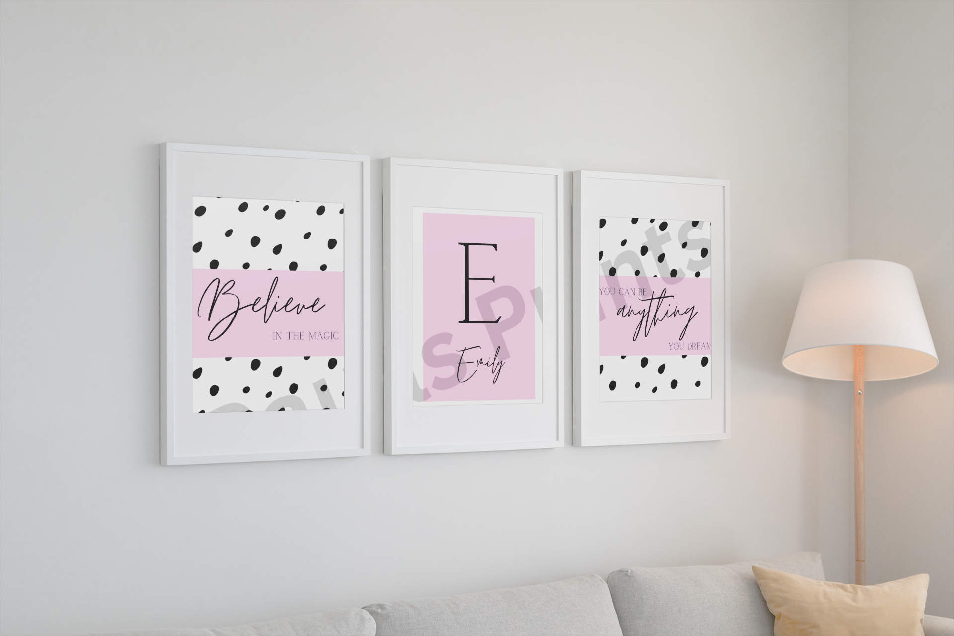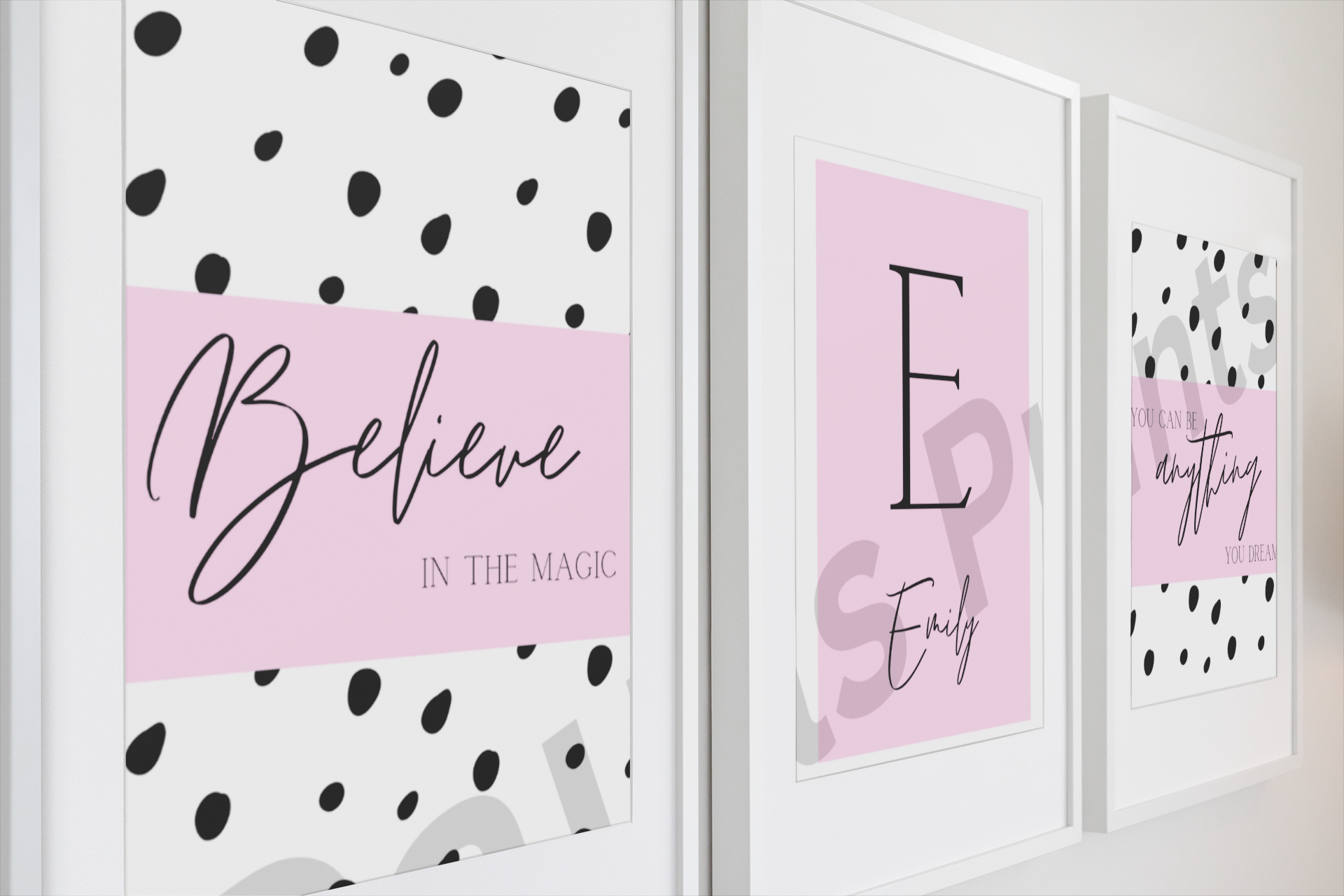 Create a soft, inspiring space with this personalised pink nursery wall art set. Featuring modern black-and-white spot designs, gentle pink tones, and uplifting quotes such as “Believe in the Magic” and “You Can Be Anything You Dream,” this set is perfect for baby girls’ nurseries, toddler rooms, or children’s bedrooms.