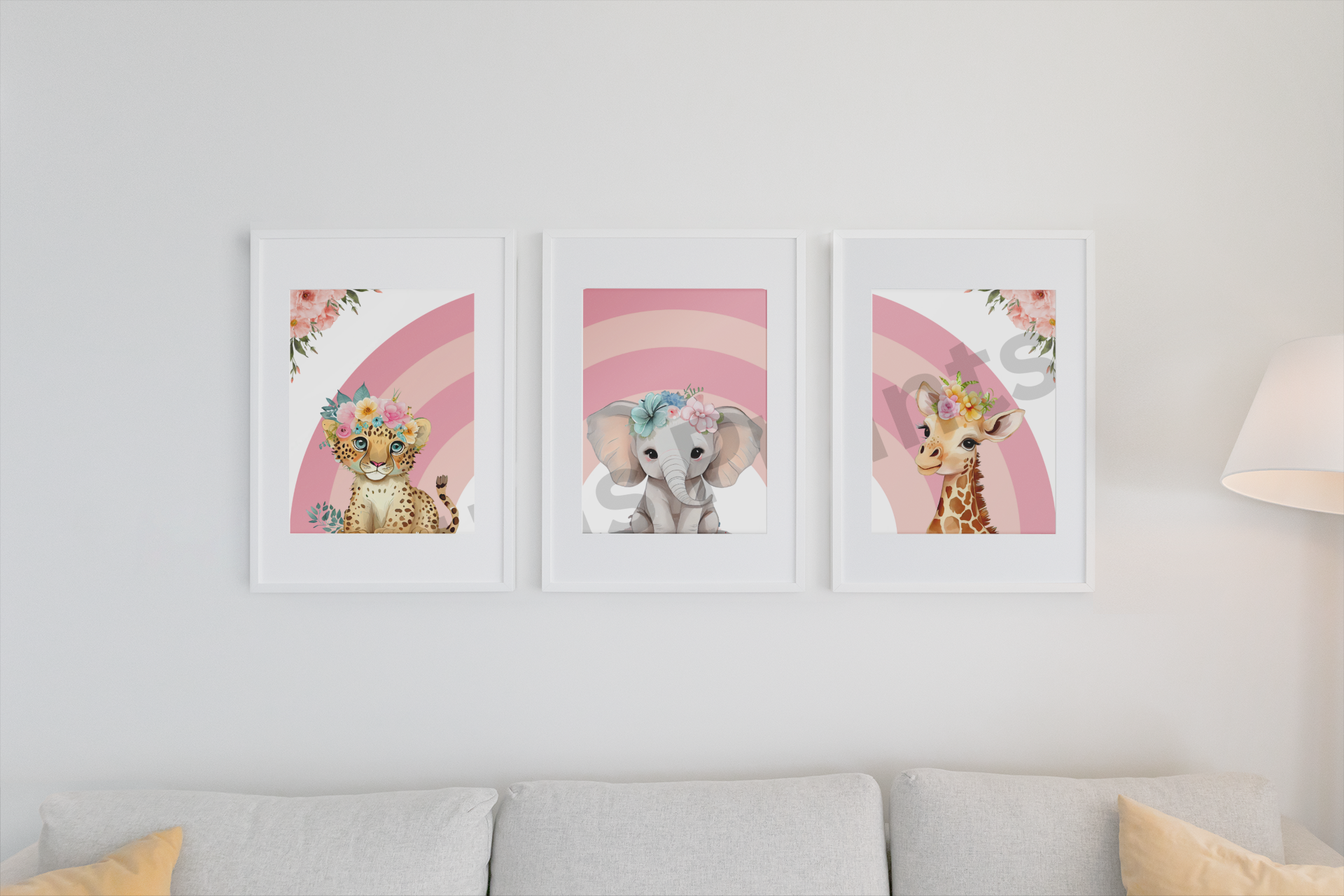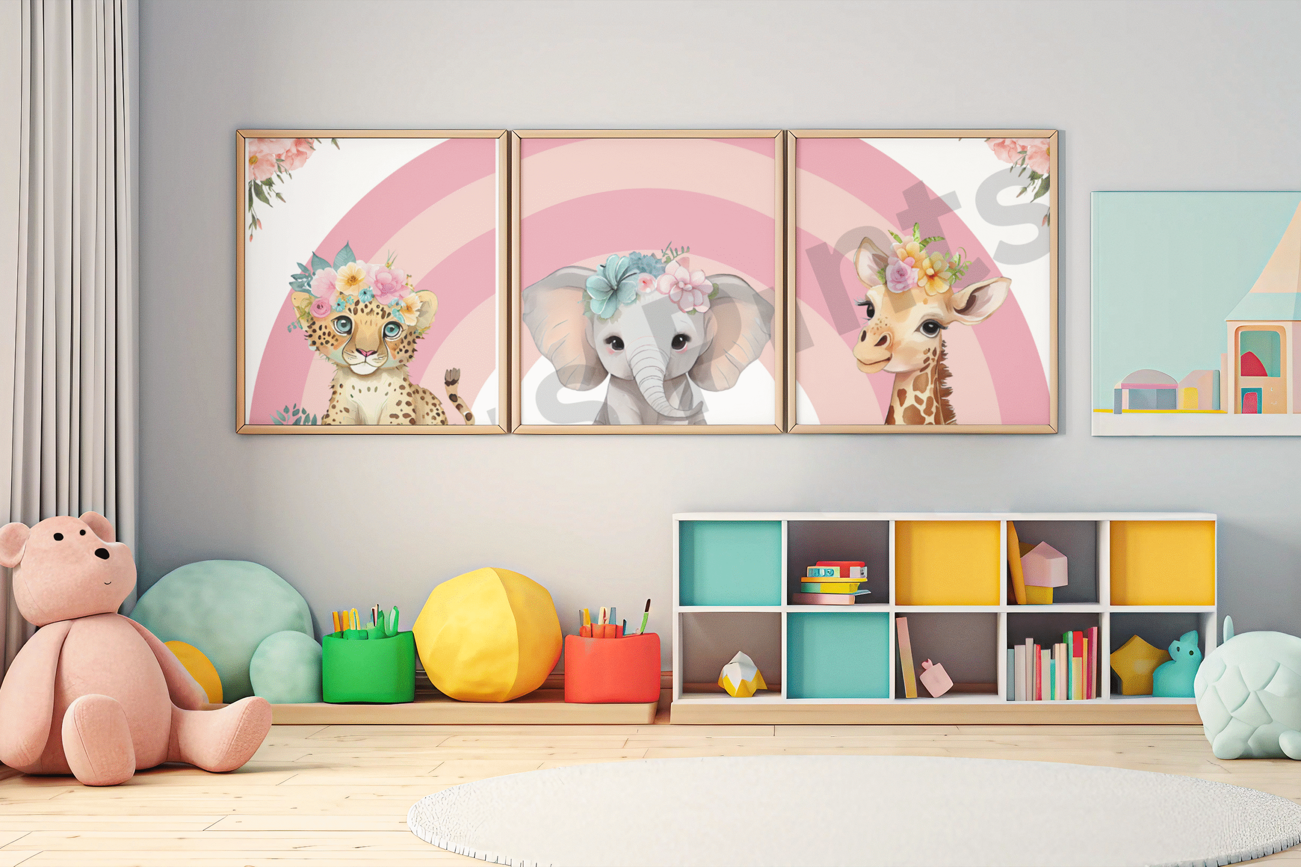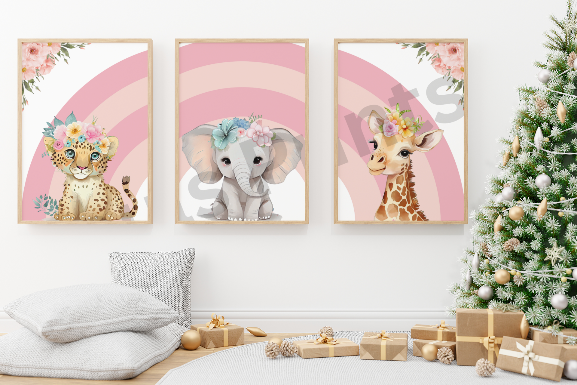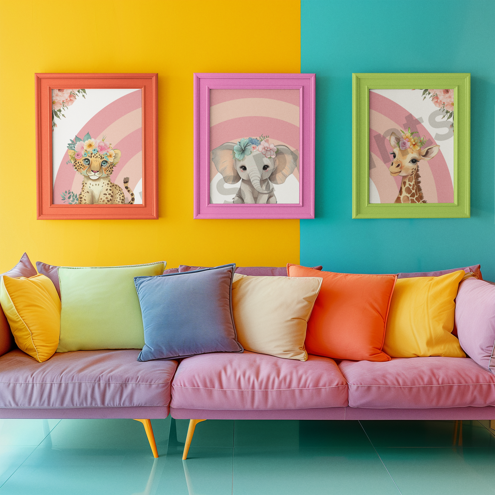 Brighten up your nursery or child’s bedroom with this charming three-piece safari animal print set. Featuring a sweet baby cheetah, elephant, and giraffe, each adorned with colourful floral crowns against a soft pink rainbow background, these prints bring warmth, playfulness, and a touch of jungle magic to your little one’s room. Perfect as a baby shower gift, birthday present, or simply to create a joyful and welcoming nursery, this set adds both style and cuteness to any décor.