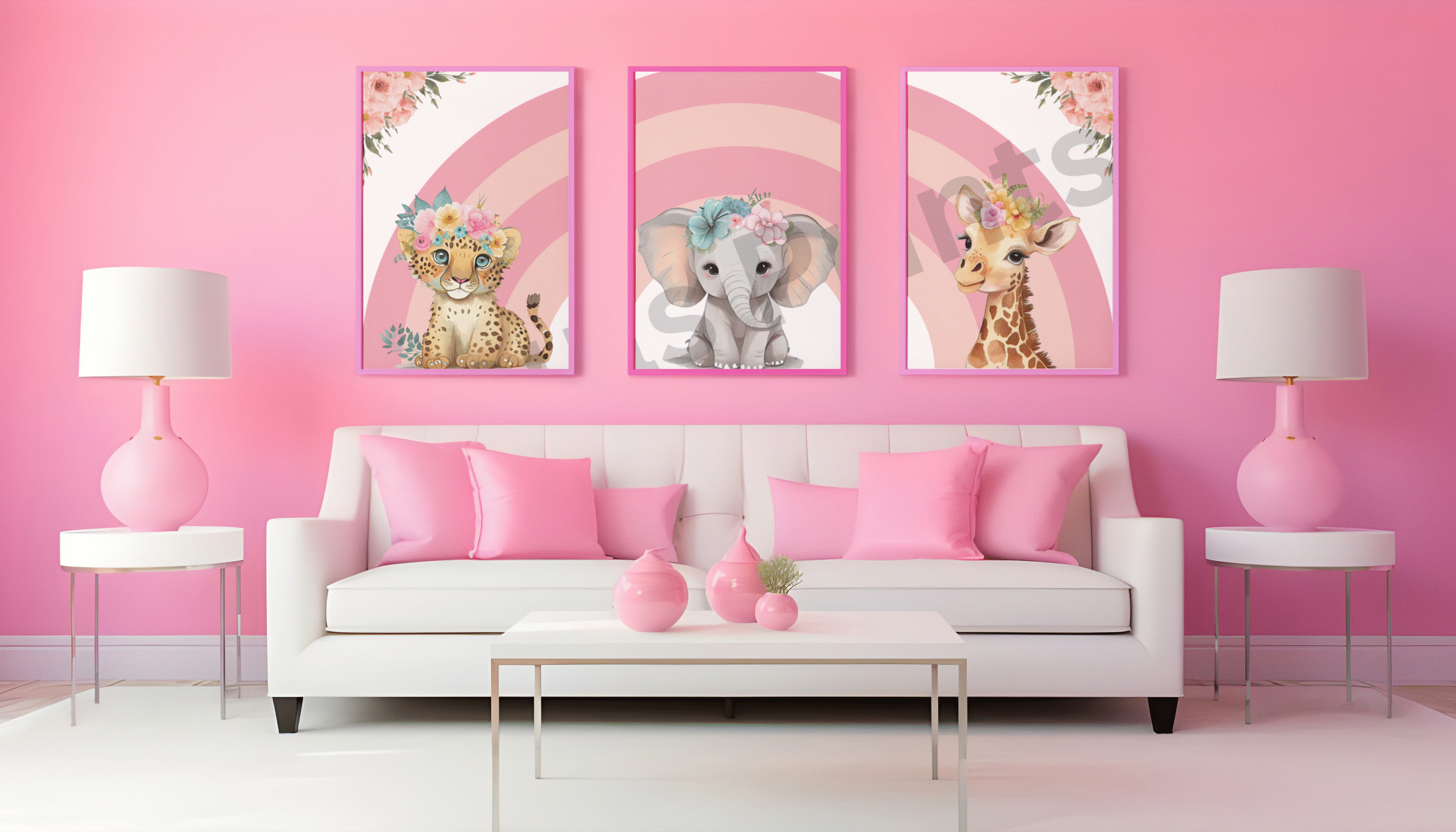 Safari Animal Nursery Wall Art Set – Baby Cheetah, Elephant & Giraffe Prints with Floral Crowns – Pink Jungle Baby Room Décor