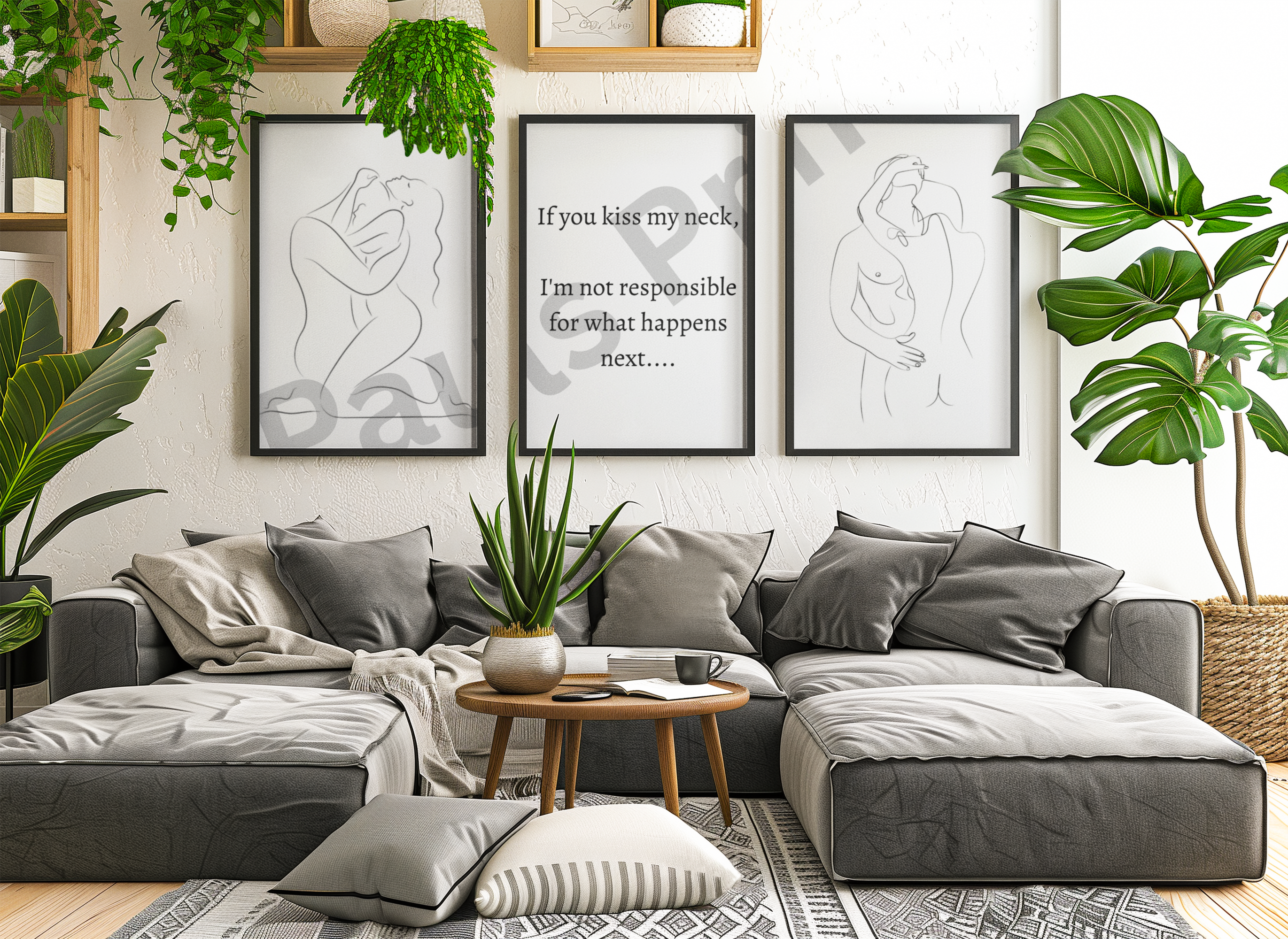 This intimate three-piece wall art collection features elegant minimalist line drawings paired with a daring, flirtatious quote: “If you kiss my neck, I’m not responsible for what happens next….” Perfect for adding a seductive yet sophisticated touch to bedrooms or private spaces, this set balances modern artistry with romantic allure.
